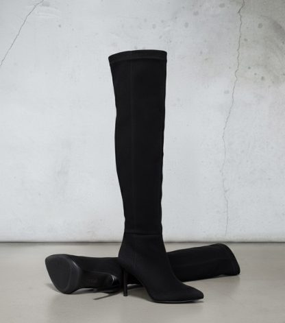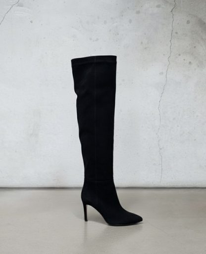 La silhouette slanciata si estende ben oltre il ginocchio, culminando in un’apertura superiore che abbraccia morbidamente la coscia. Il design a punta affusolata aggiunge un tocco di sofisticata grinta, bilanciato dal tacco a stiletto che slancia la figura in modo impeccabile, assicurando una camminata decisa e sensuale.