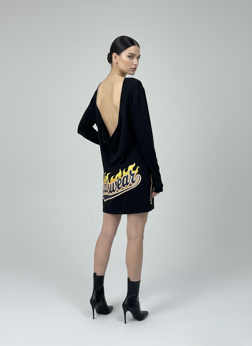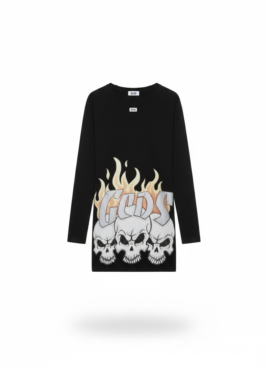Realizzato in jersey di cotone nero di alta qualità, l’abito presenta un design oversize a strati, con maniche lunghe sovrastate da maniche corte per un effetto “double layer” tipicamente urban. Il fronte è dominato da una grafica iconica: tre teschi avvolti da fiamme vibranti e il maxi logo “GCDS” in stile rock.