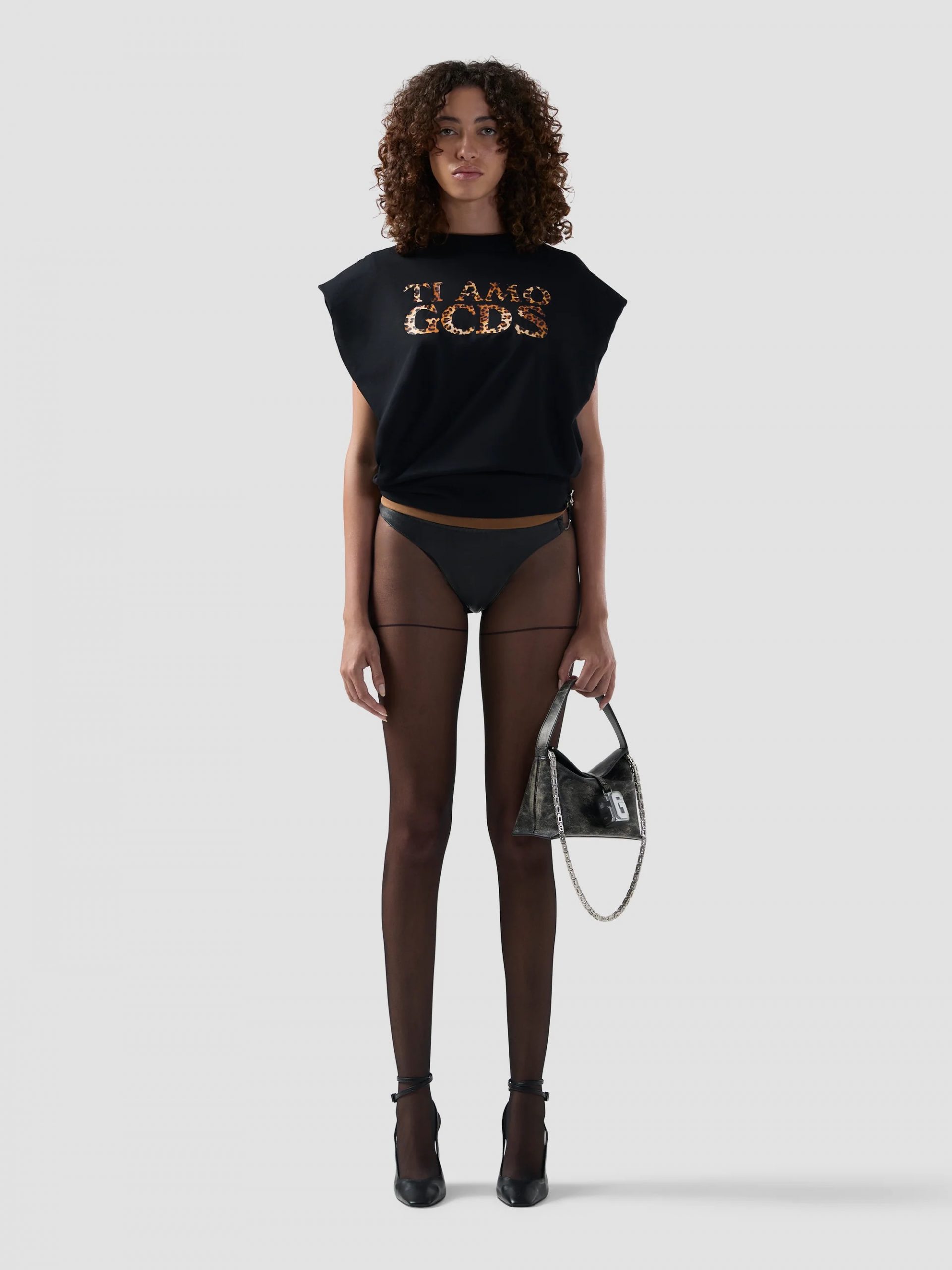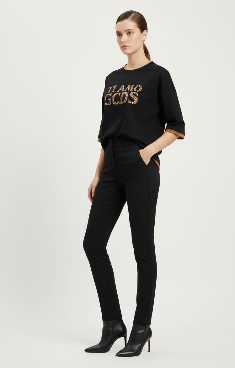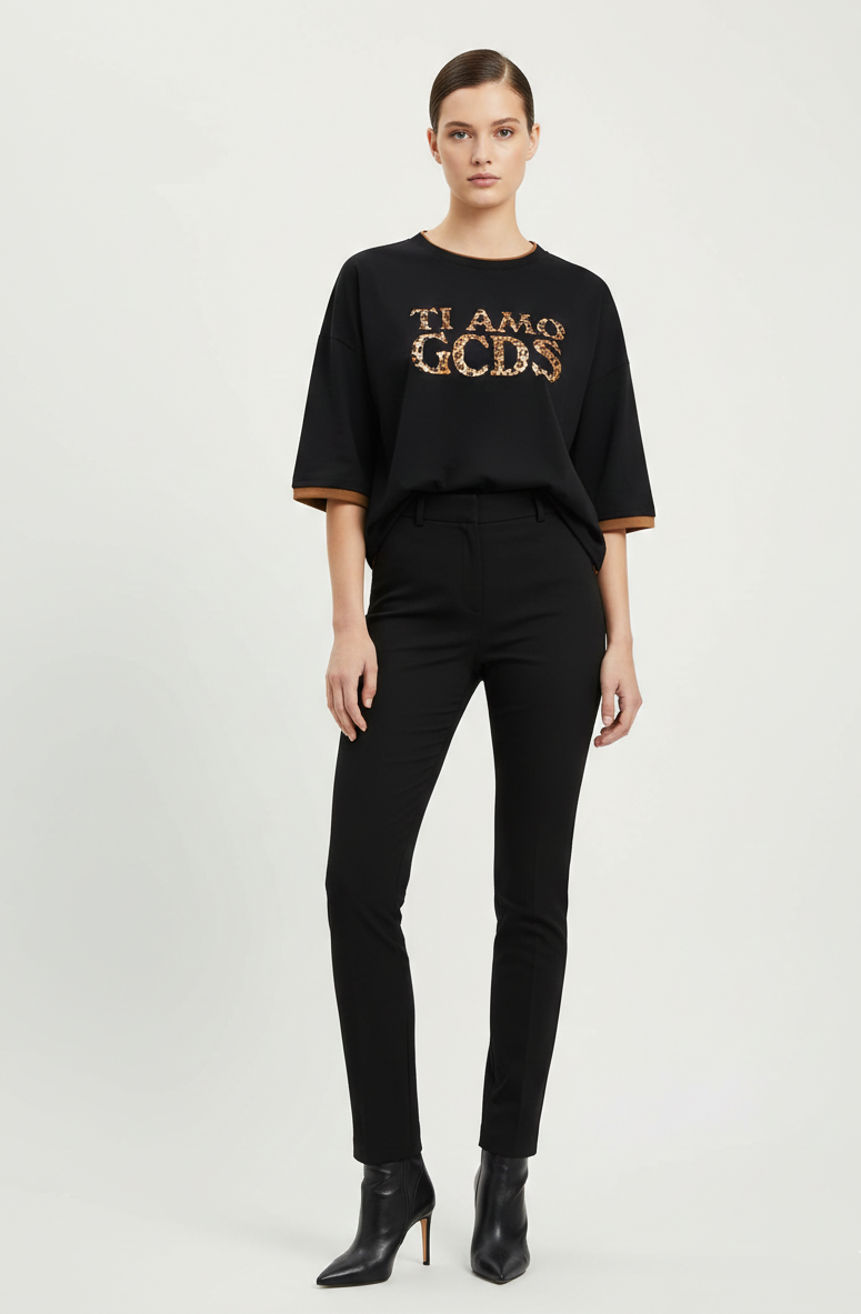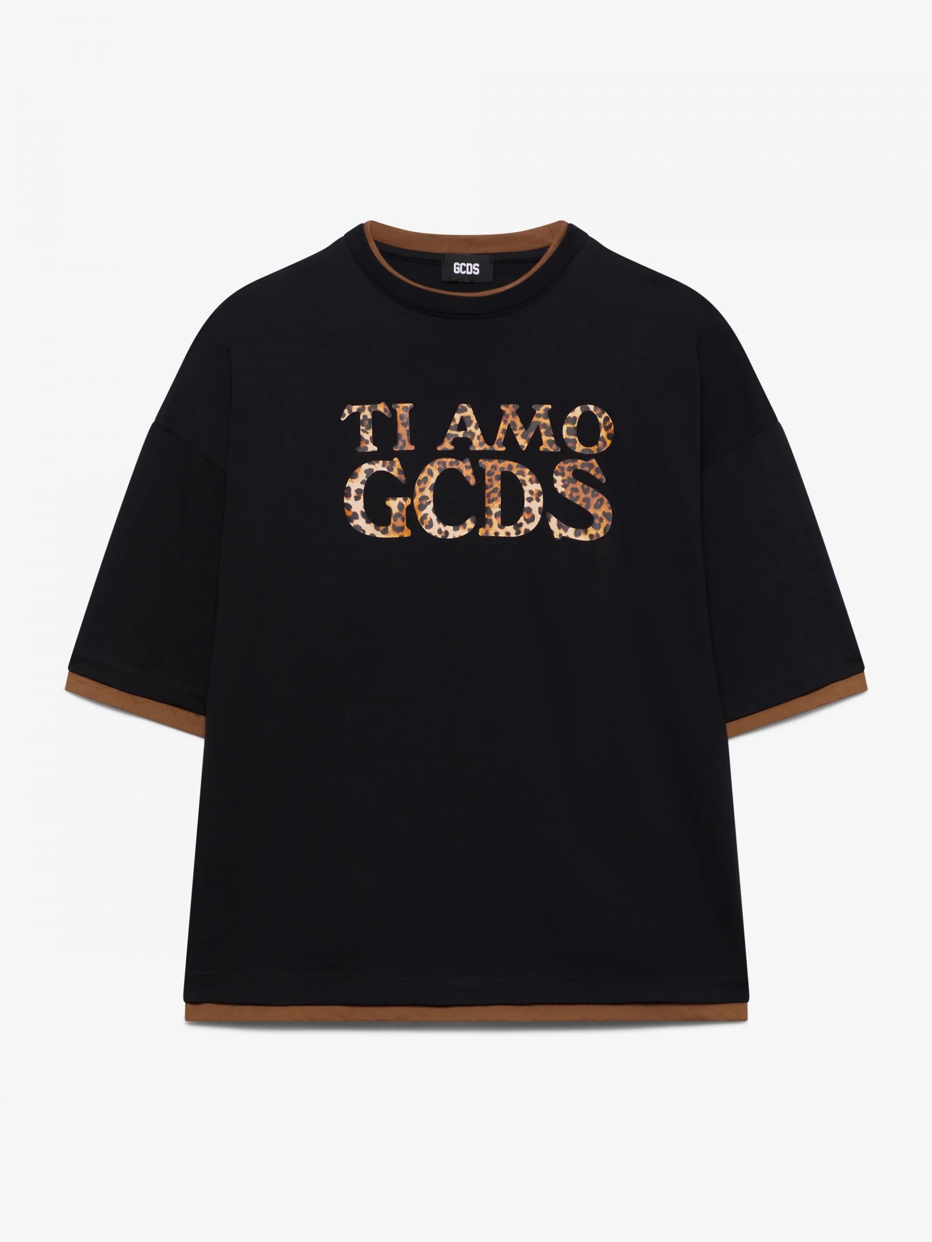 – Vestibilità: Oversized fit – Stampa logo “TI AMO GCDS” effetto animalier – Girocollo – Bordi a contrasto – Maniche corte