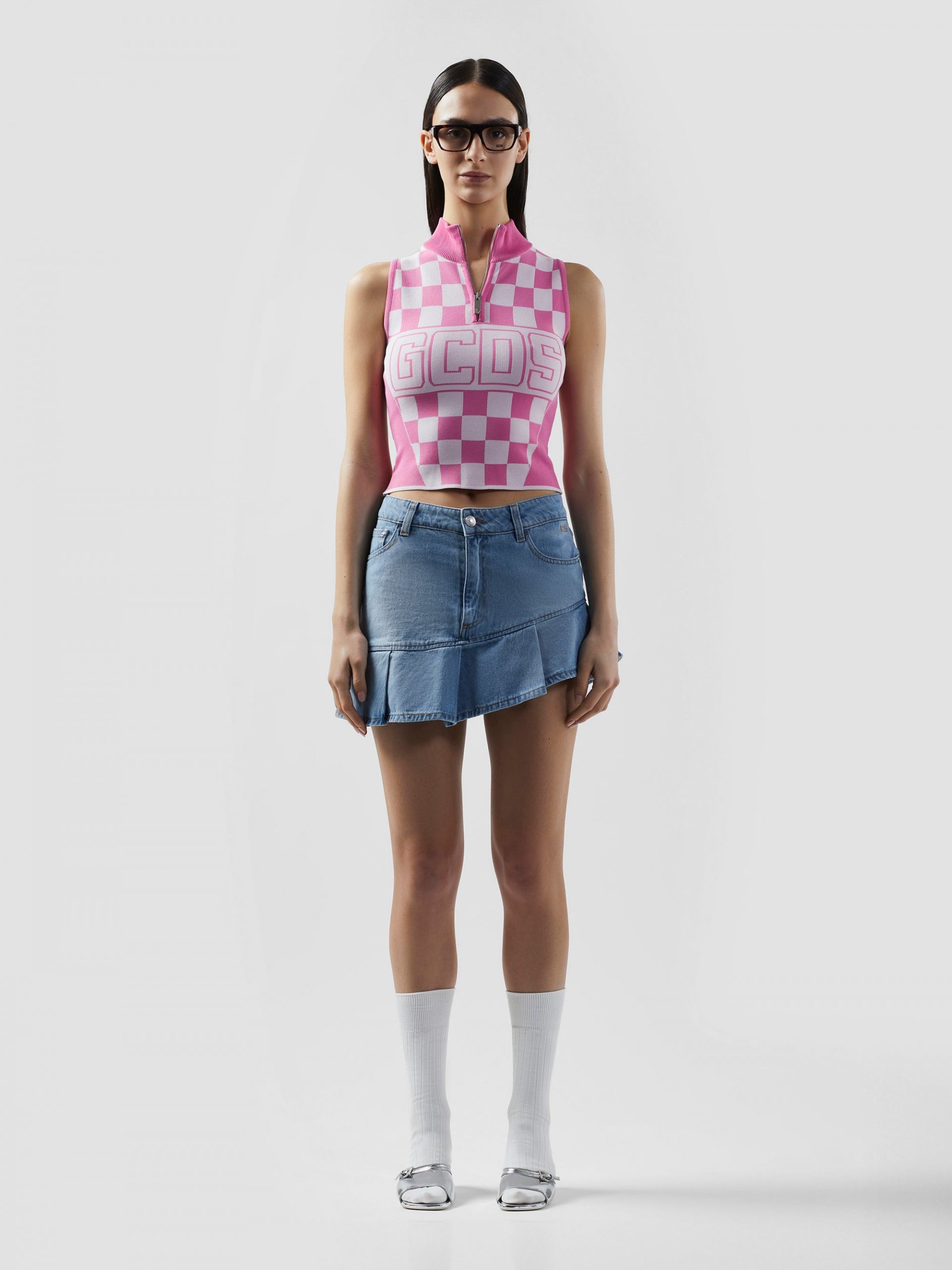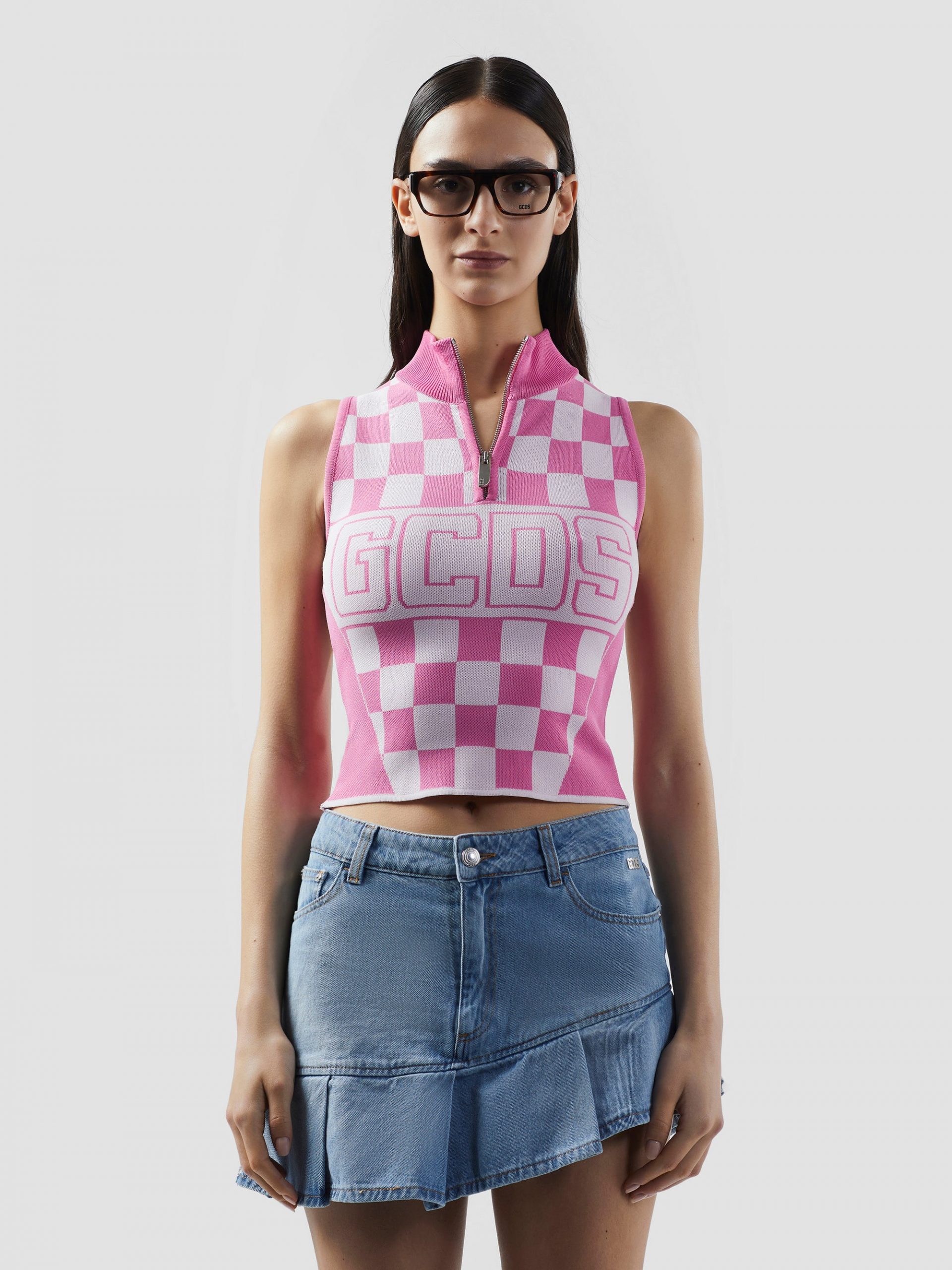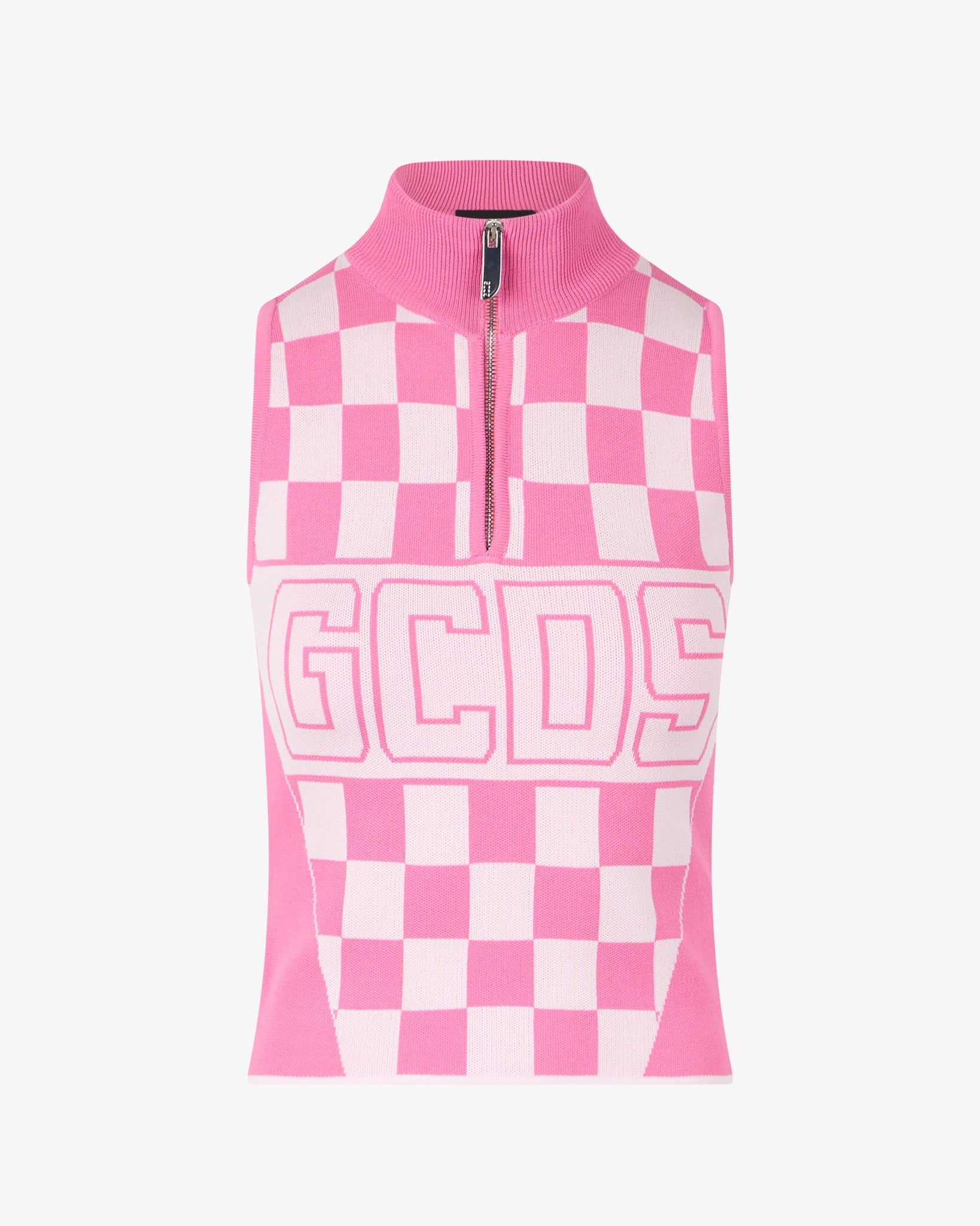 Top senza maniche con mezza zip e collo a ciclista, arricchito da un motivo damier e logo a banda sul davanti