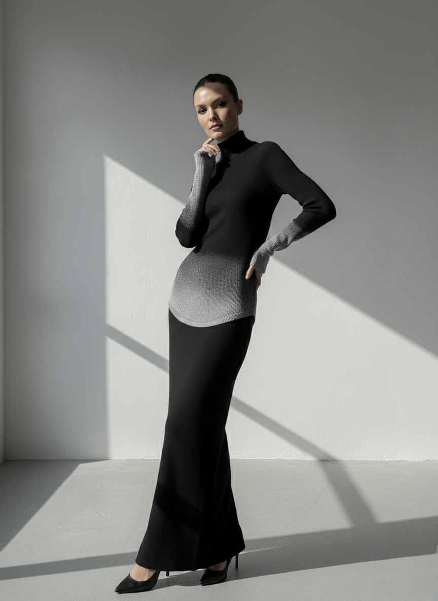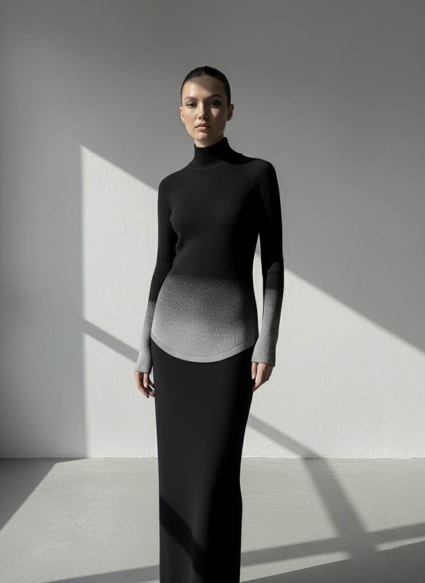 Dolcevita a maniche lunghe in maglia a costine con finitura laminata effetto degradé su busto e polsi. Vestibilità aderente, perfetta per look decisi e sofisticati.