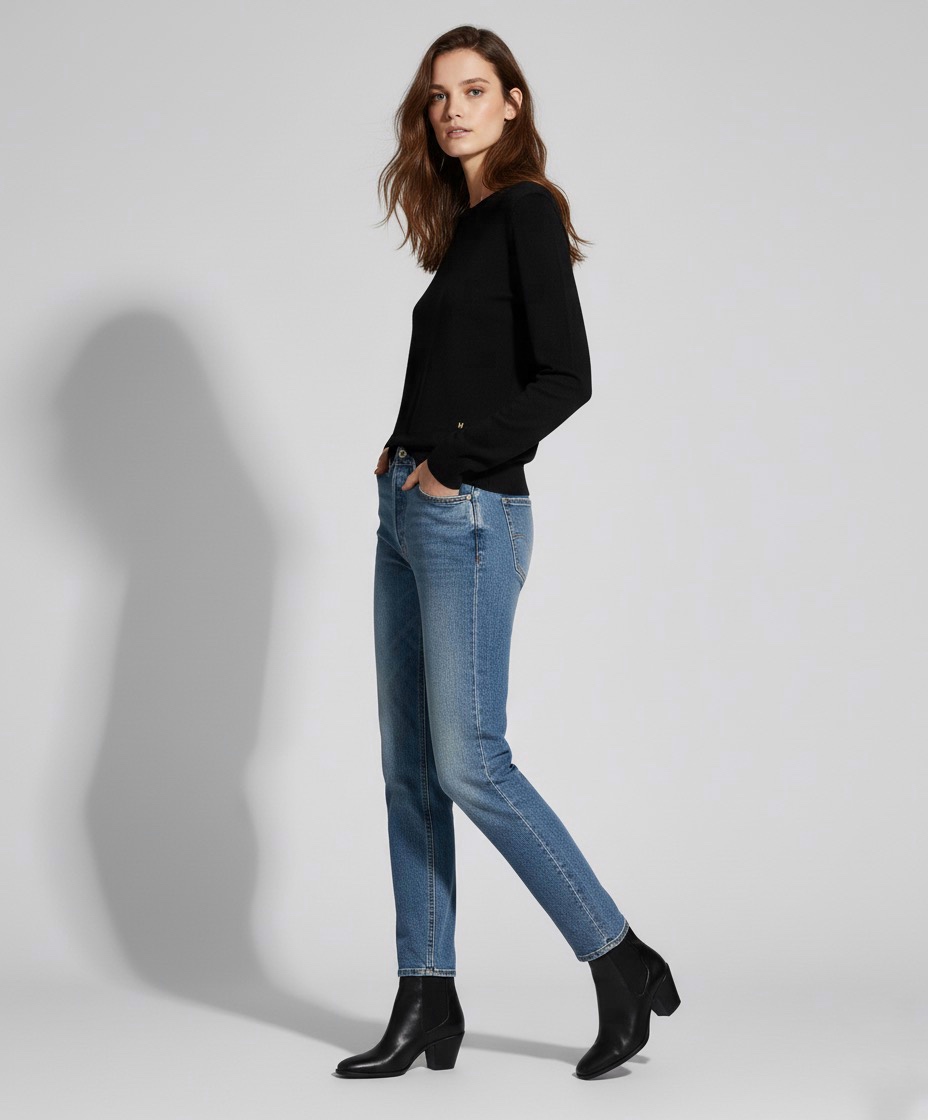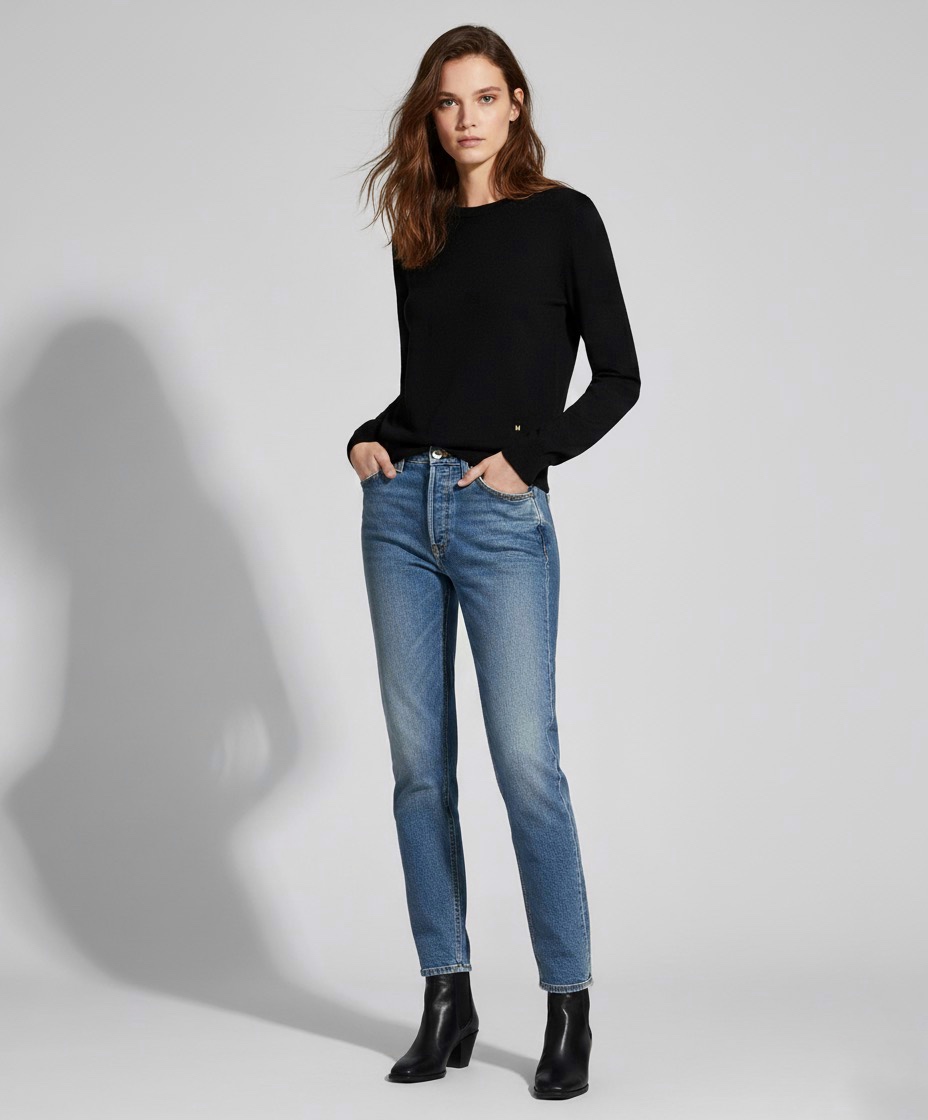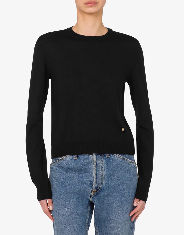 Pullover in lana ultrafine e seta con piccola lettera M in galvanica oro.