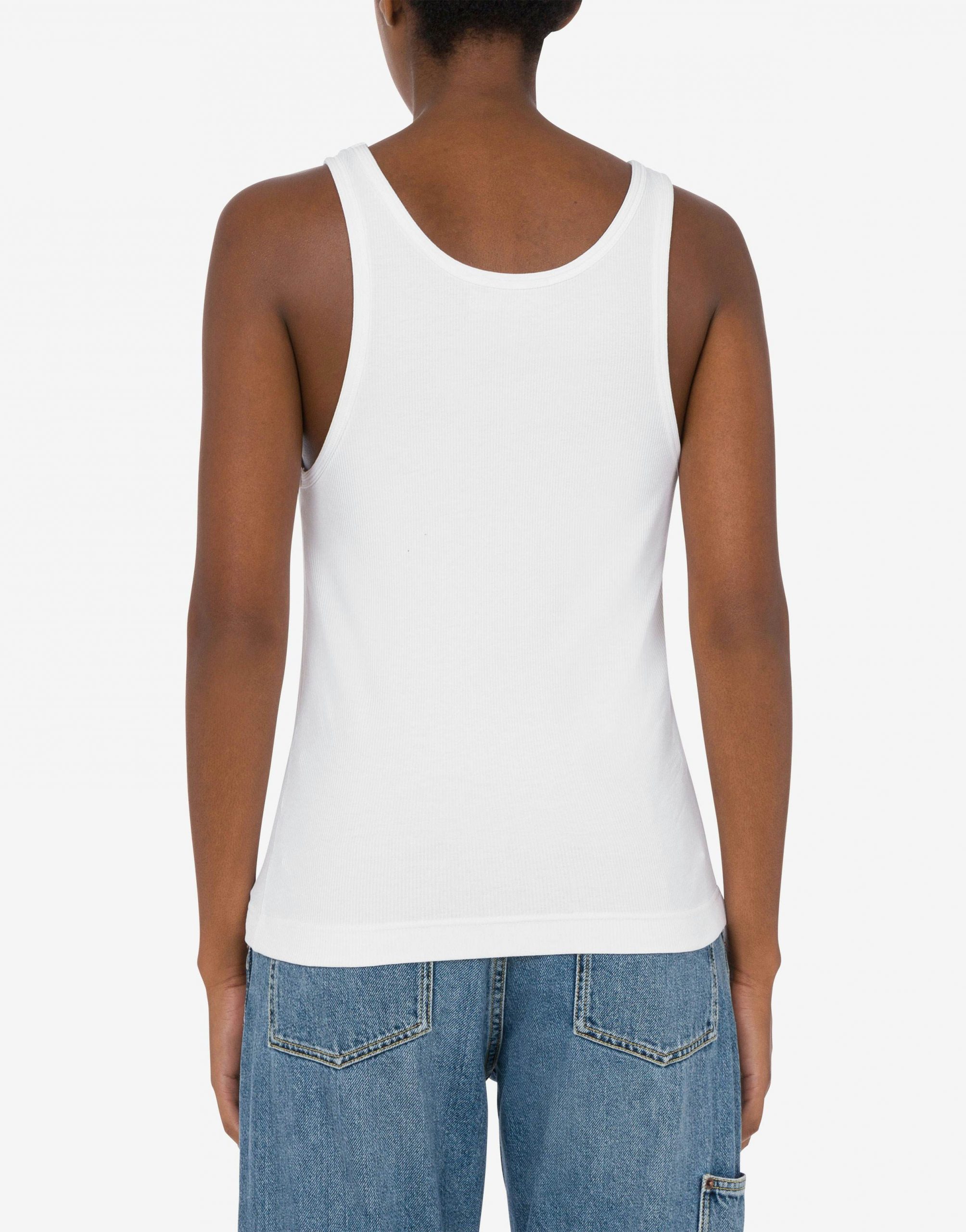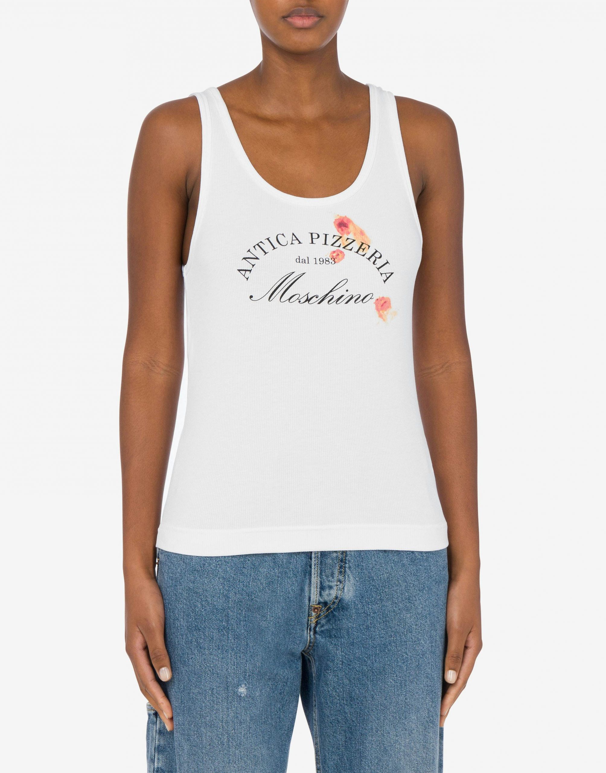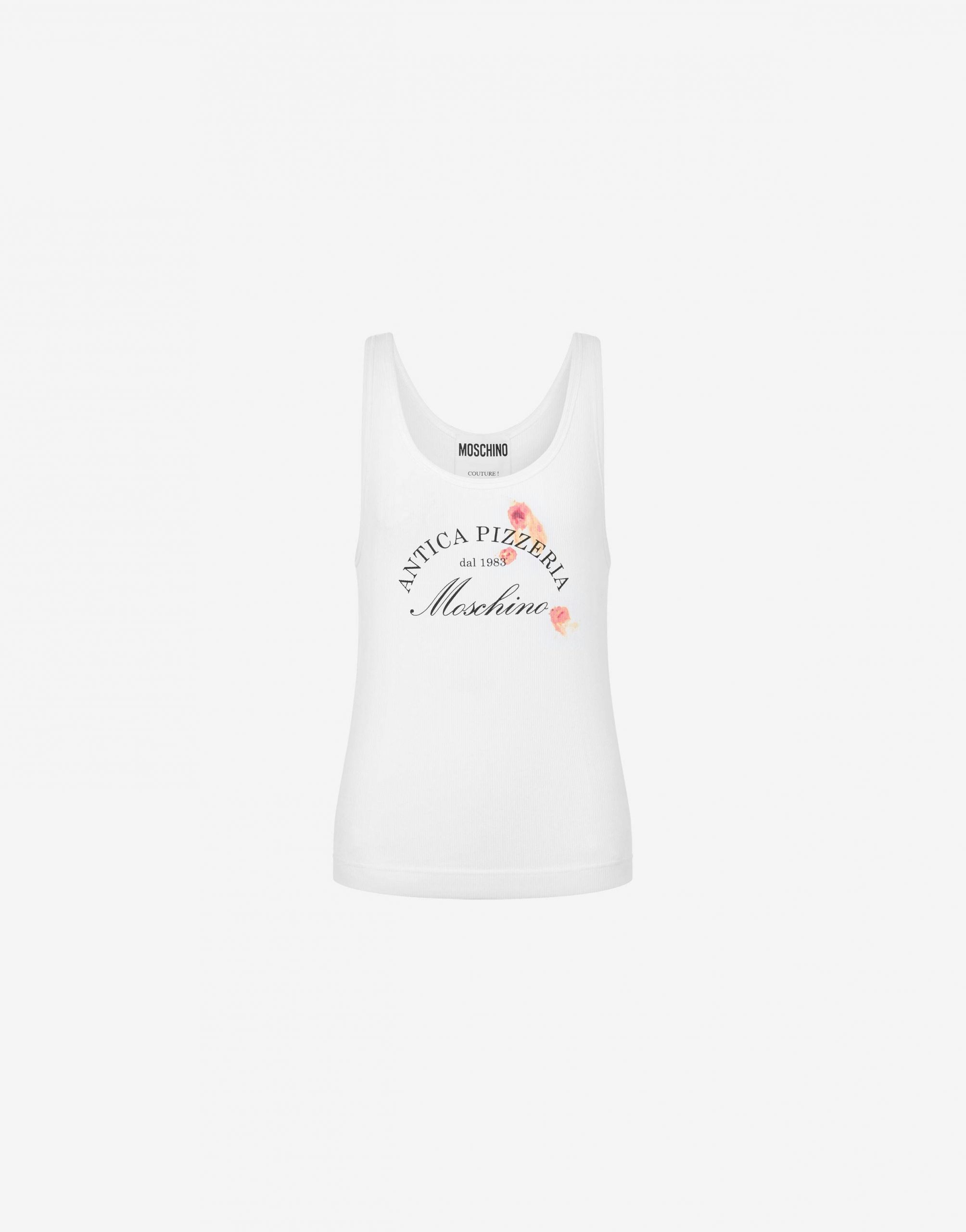 TANK TOP IN COTONE STRETCH CON LAVORAZIONE A COSTINE E STAMPA ANTICA PIZZERIA MOSCHINO SUL DAVANTI.